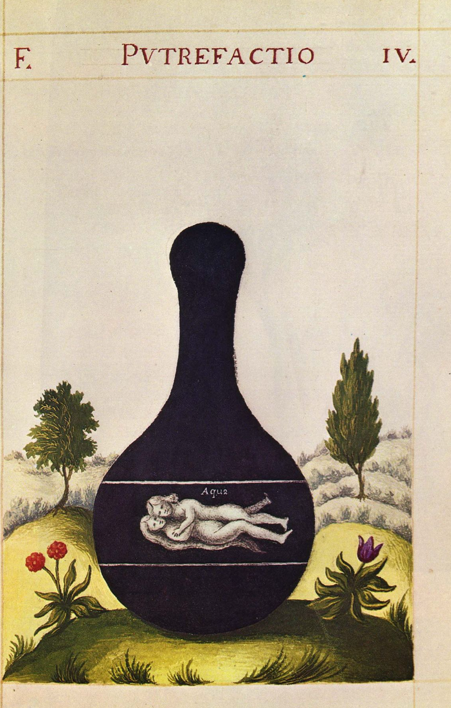Hand-colored engraving illustrating the alchemical stage of putrefaction (Nigredo), in which matter is sealed in darkness and dissolved back into its primordial state (Chaos Philosophorum) as the necessary precondition for regeneration and transformation.