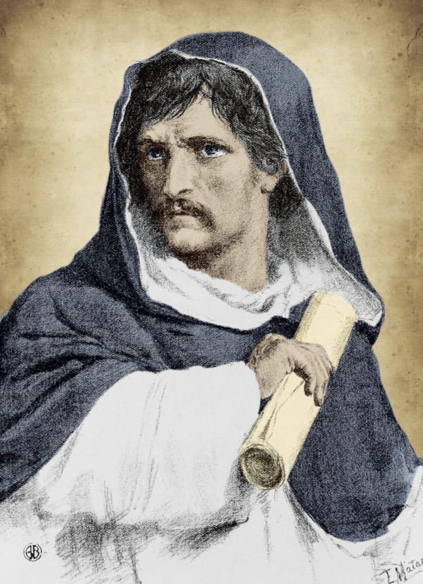 Burned at the stake for heresy in 1600, symbolizing the conflict between mystical vision and institutional control.