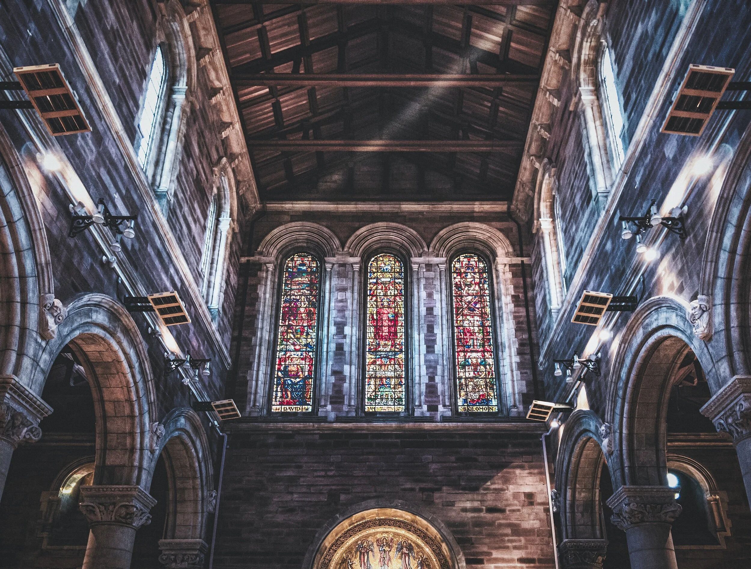 Interior of a church with stained glass windows, stone arches, and a wooden ceiling.