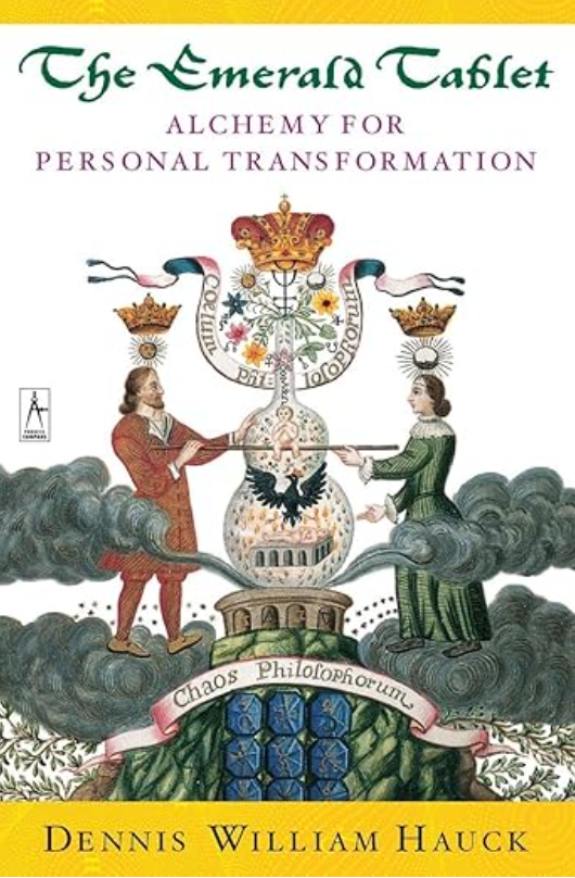 • The book cover titled "The Emerald Tablet: Alchemy for Personal Transformation" by Dennis William Hauck. The cover features two people in period clothing, holding a rod together over a mystical, elaborate globe emitting clouds and smoke, with a crown, crowns, and symbolic elements in the background.